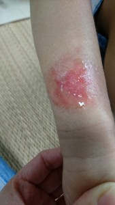 お子さんの足の指に見られた非常に重症なとびひの写真です。お子さんは熱と頭痛の状態で来院されましたが、蜂窩織炎の様の重症なとびひの発疹が足に見られお子さんは歩けない状況でした。抗生剤が効かないタイプの耐性菌のとびひと考えて治療を開始しました。2日後には解熱し、とびひが改善して歩けるようになりました。初診時のとびひの細菌検査の結果は耐性菌のMRSAでした。このような重症のとびひでは、発熱や頭痛や歩行困難といった皮膚以外の症状が出ることがありますのでとても注意が必要です。また治らないとびひや重症のとびひの場合には、抗生剤の効かない耐性菌が原因のことがよくありますので治りにくいとびひは、早めに受診をお勧めします。